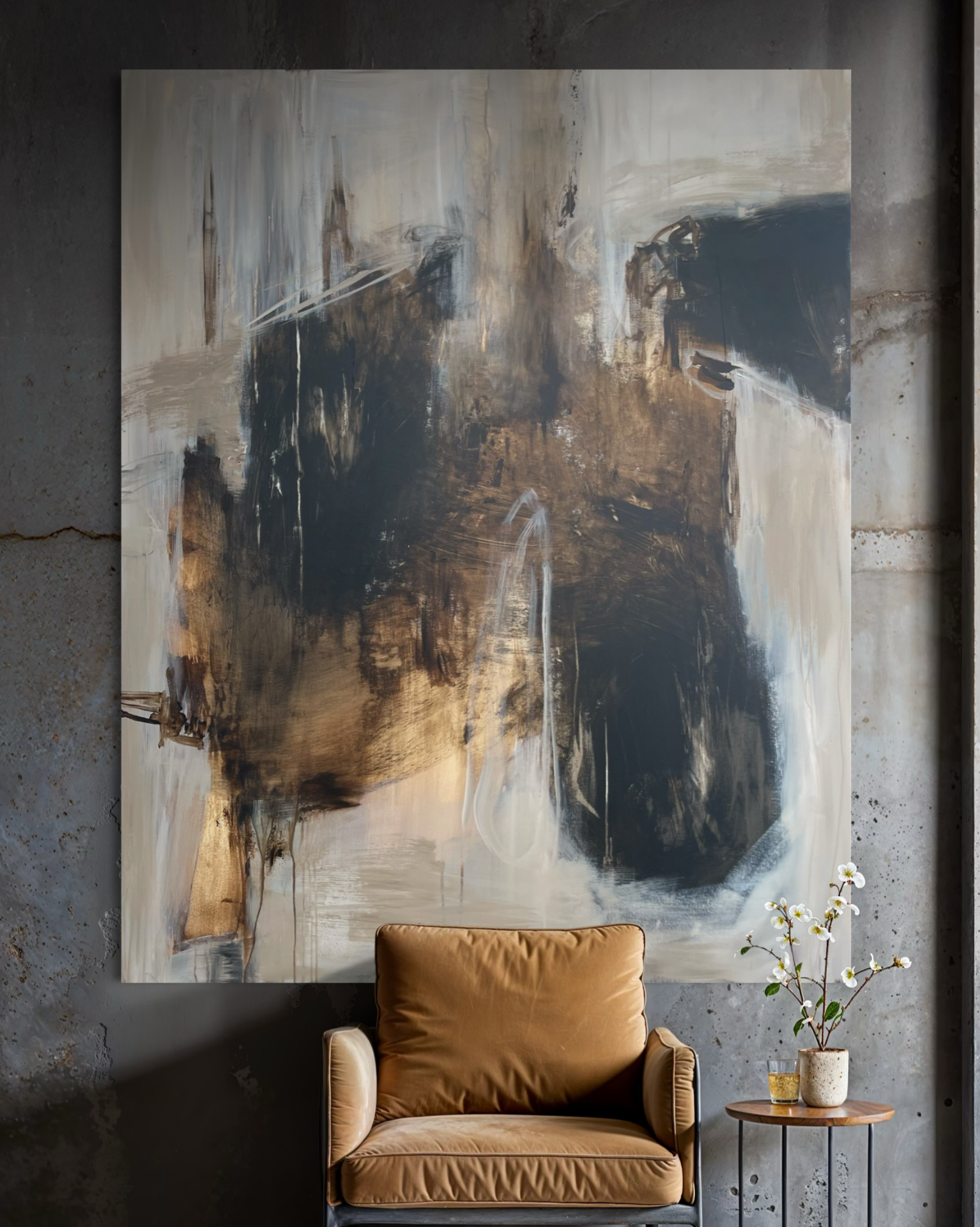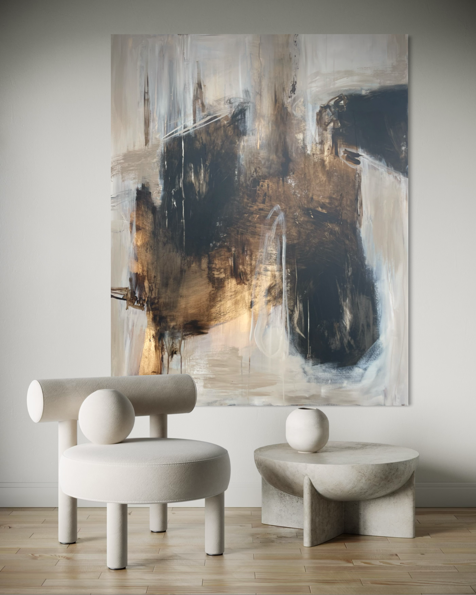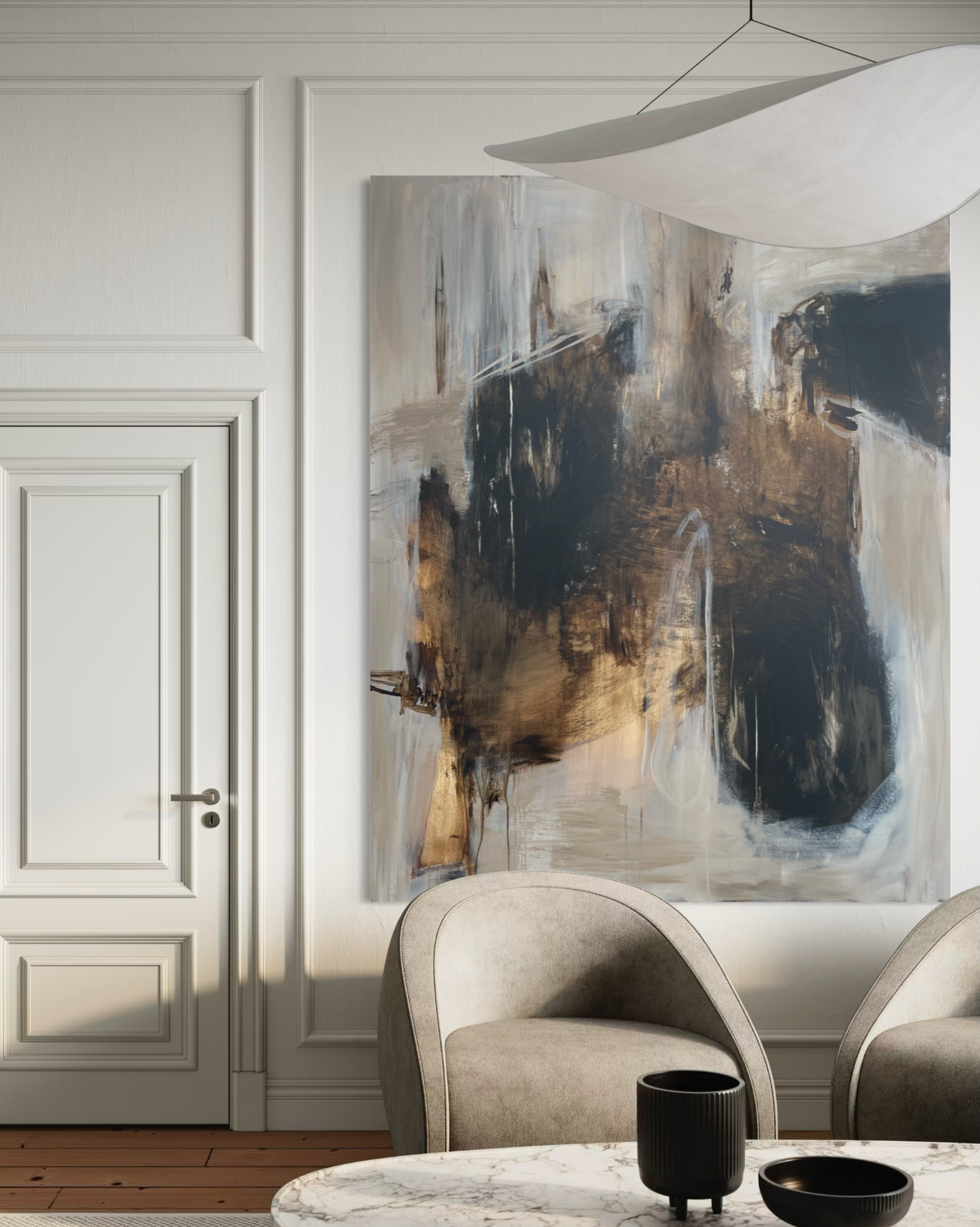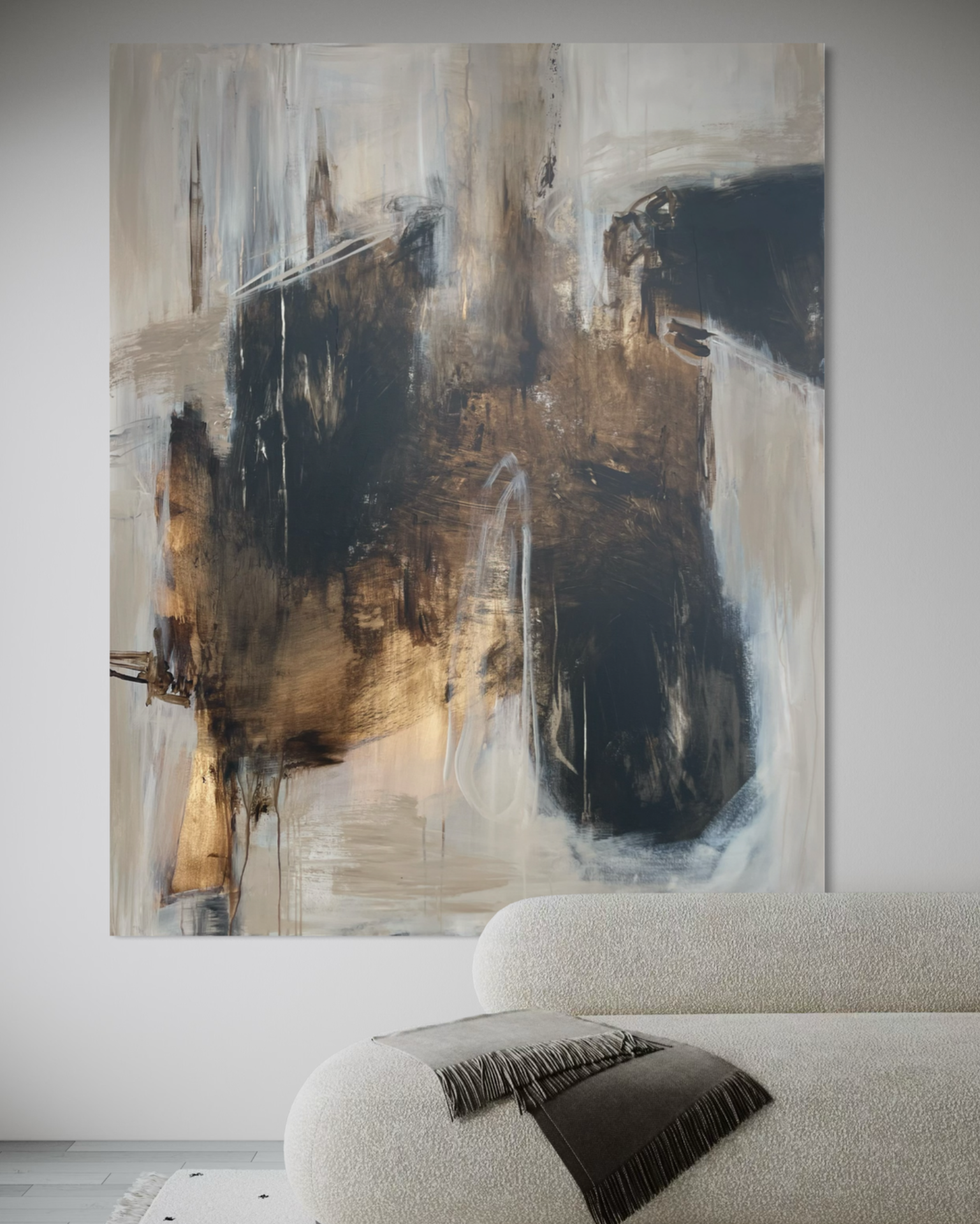 Stort maleri til stuen i beige, brune og sorte toner