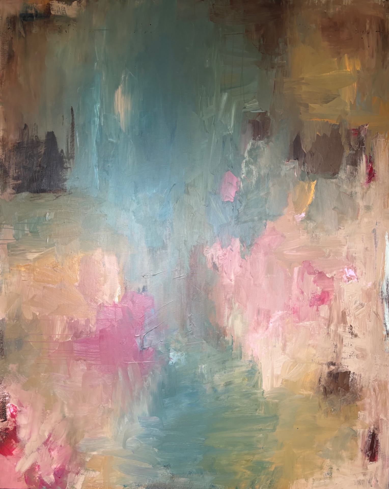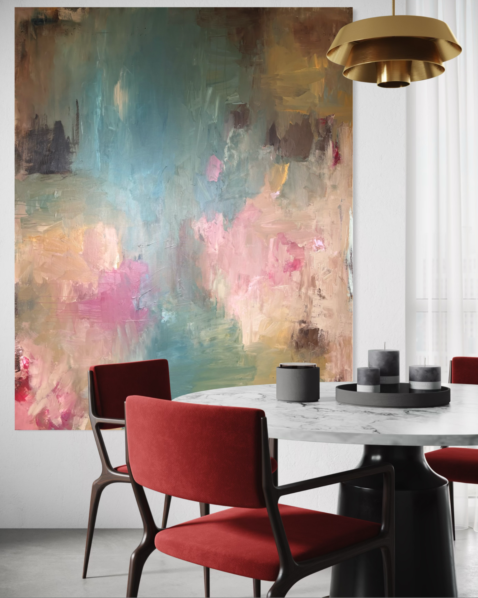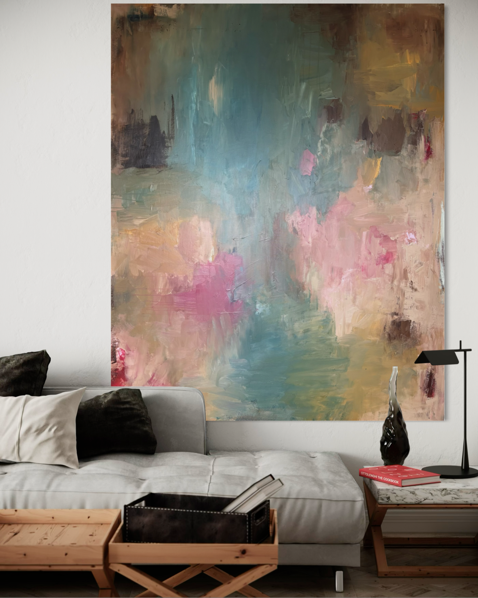Originalt Abstrakt Maleri pastelfarver - turkis, rosa, beige og grønne toner