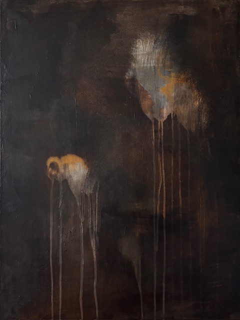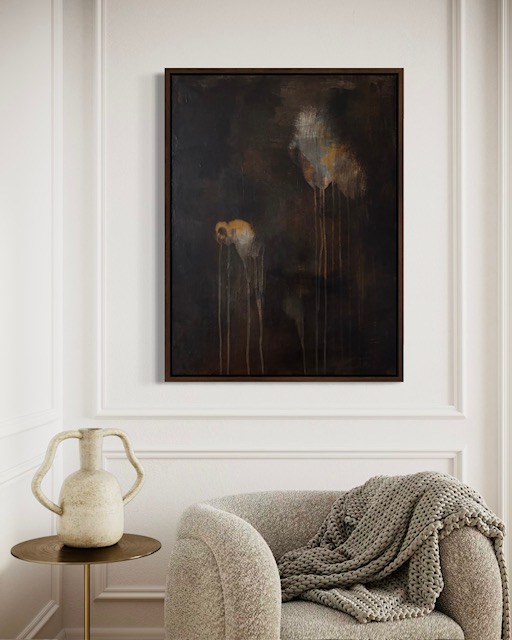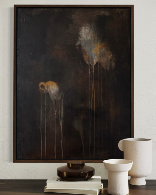 Originalt Abstrakt Maleri i mørkebrune/sorte, orange, grå toner